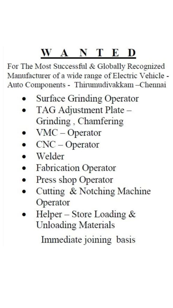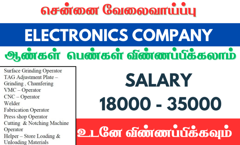 சென்னைக்கு மிக அருகில் உள்ள திருமுடிவாக்கம் என்னும் இடத்தில் அமைந்துள்ள எலக்ட்ரானிக்ஸ் நிறுவனத்தில் தற்பொழுது நேரடி நேர்முகத் தேர்வு நடைபெறுகிறது எனவே சரியான கல்வி தகுதியும் வயதுவரம்பு முறைய அனைவரும் உடனடியாக விண்ணப்பித்து பயனடையுமாறு கேட்டுக்கொள்கிறோம்.