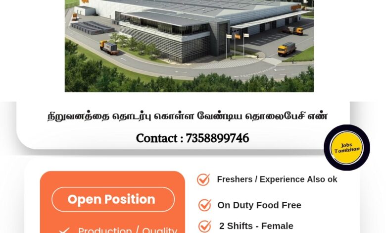 உங்களுக்கான வேலை வாய்ப்பாக உற்பத்தி துறை மற்றும் சரி பார்த்தல் துறையில் வேலை வாய்ப்புகள் ஏற்படுத்தப்பட்டுள்ளது.