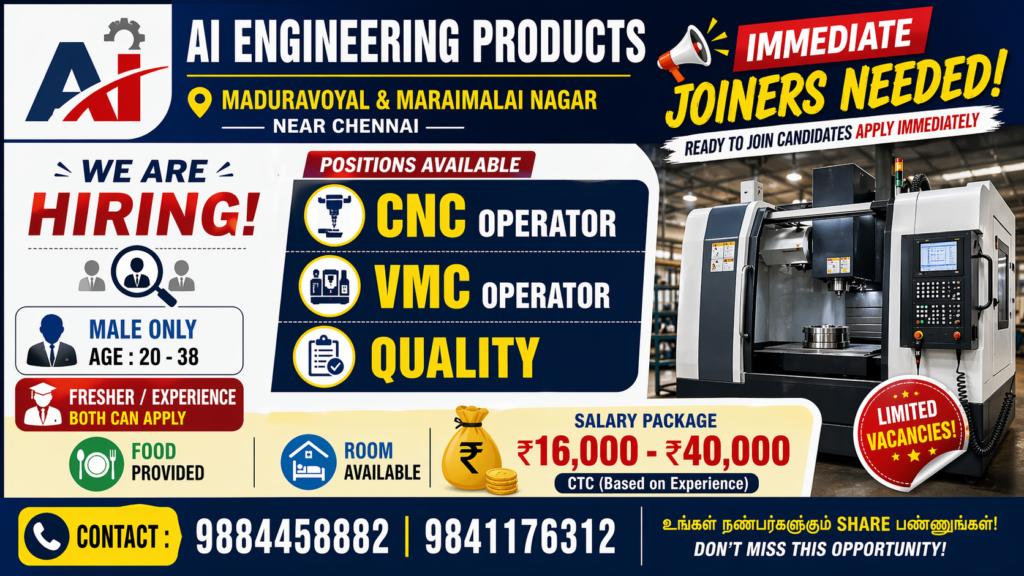 Chennai jobs, CNC operator jobs, VMC jobs in Chennai, fresher jobs Tamil Nadu, manufacturing jobs Chennai, latest job vacancy 2026, jobs for male candidates Chennai